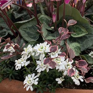 ちょっと大人な寄せ植え🩷周りが落ちついた色なので白が映えます🩷宿根イベリスさんは庭に何年も放ったらかしでも咲いてくれる優等生さんです