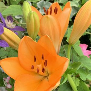 きょうのお花🧡庭のゆりちゃん、咲きました🧡全開より、開きかけの時が好きです🧡周りのお花さん達もゆりちゃんが咲いて嬉しそうです🧡