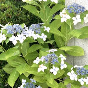 庭のガクアジサイさん🩵この紫陽花さんの葉っぱは明るい黄緑色なので、気に入ってます💚💚紫陽花の花と同じく葉っぱの色もそれぞれ違いますね😊