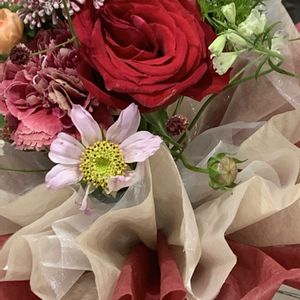 フラワーアレンジメントに秋の花、コスモスさんが入っていました🩷コスモスさんを見たら秋を感じます🩷赤薔薇🌹さんは不動のセンターですね🌹