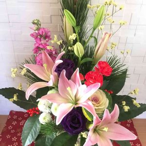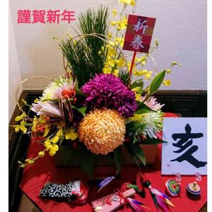 謹┃賀┃新┃年┃ ━┛━┛━┛━┛ ┏┓┏┓ ┓┏┓ ┏┛┃┃ ┃┗┫ ┗┛┗┛ ┻ ┛ 今年一年が素敵な年に なりますように。:°ஐ*。°ʚɞ* 🎍∞*:;;;;:*∞*:;;;;:*∞*:;;;;:*∞🎍 明けましておめでとう御座います🎍 本年も宜しくお願いします❣️ 猪の様に猪突猛進とは 行きませんが😉 自分なりのペースで これからもGSを皆様 と一緒に楽しんで行 けれたら嬉しく思い ます😊 お正月のお花をアレンジ してみました😌 お花の名前 マム 若松 オキシジューム 百合 千両 飾りに水引飾り マムを中心にこんもり とお正月らしく華や かにアレンジをして みました😌