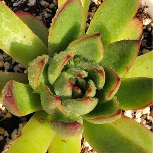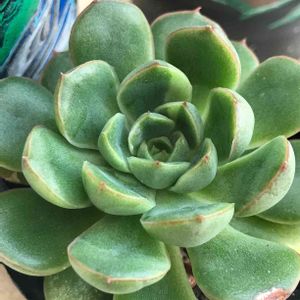 詳しい人に聞いてみたい 先日弟に買って貰ったクリスマスなんだけど中心の2枚の葉縦に色が抜けてるように見えるんだけどこれは斑かな🤔❓ 斑だったらエケベリア初めての錦になるな~❤️ どう思います❓
