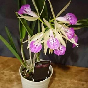 園芸店で目にとまりうちに来ました。 蘭も大好きです🍀😌🍀 お名前は… 『 ブラソカトレア オーグレイズコミックページ 』 「 ラン科、交配種 」 「 実生苗ですので、株、花など個体による変化が楽しめます。 」 …とコメント表記がありました。 幾つかある株のうち咲いているのを選びました。 来年また咲いてる姿を見たいなっと!! 環境に順応してくれたらいいんだけど… 気温は10~35℃と暖かいとこが好きみたいです。 もう今から冬場の温度管理が心配です!