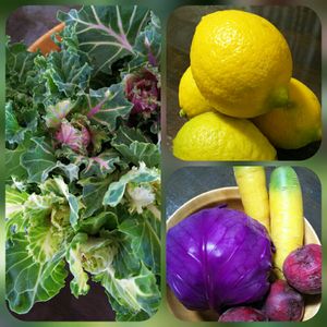 収穫👍カラフル野菜 レモン、色付いたものから収穫してます🎵 黄人参、ビーツ、紫キャベツ。 プチヴェールルージュ、ホワイト、発色がイマイチですがこれから寒さ❄にあたり甘みも増してくるかと期待してます😋