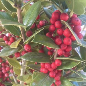 クリスマス オーナメントに使われる この真っ赤な実は チャイニーズホーリーです。 よくクリスマスホーリーの名前で流通していますが クリスマスホーリーは西洋ヒイラギ(イングリッシュホーリー)のことで原産地も葉の形も違います。 和名はヤバネヒイラギモチ(矢羽柊黐)と呼ばれますが モクセイ科のヒイラギとは異なり モチノキ科に属します。 雌雄異株ですが "単為結果(受粉しなくても実がなる)"と言って 雌株だけでも実がつくのだとか…。 ちょっと ビックリです…。😆 ※チャイニーズホーリーの葉は亀の甲羅のように角ばっていて若木の間はトゲトゲがありますが老木になるにつれて刺が減り丸みを帯びて来るようです。 中国東北部や朝鮮南部原産。 モチノキ科モチノキ属の常緑小高木。