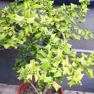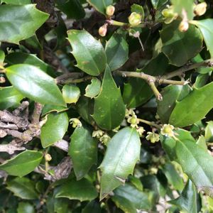 みーさま、miyukiさまに名前を教えて頂きました。ありがとうございます😊調べてみるとチャイニーズホーリー=ヒイラギモチで、流通上はクリスマスホーリー=セイヨウヒイラギとも呼ばれるようですが実際にはこちらは棘の数が多くなるようですね。勉強になります😃