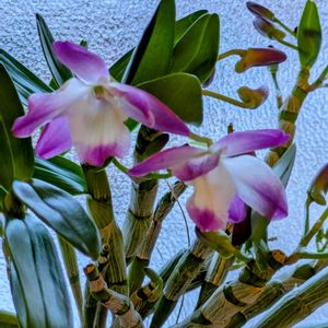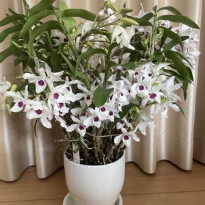 間違えて押してしまったので再投稿💦 トイレの窓際に置いてるデンドロたち、花が咲きましたよ👍手前の花の大きいこと✨後ろはこれ以上大きくならないような… 夏に咲いた跡があるバルブの違う節からでています。今年は何故か葉が落ちきらず、まるで売り物(言い過ぎ💦)のように葉っぱと花がある〜🤗 苦節6年…花友さんに教えてもらい夏は外に出し、晩秋取り込んでからも暖かい部屋には入れず、16℃くらいの明るい場所(条件にあうのはトイレだけ😅)に置くようになってから毎年花が増え、バルブもたくましいのか育つように😚でも花が同じに見える…2種類あるはずなんだけど?ムチムチのバルブとスラリとしたのとで種類が違うはず…と分けて植えてるんだけど…🙄ま、いっかあー😅パンパンだから春になったら分割、植え替えでしょうか⁉️