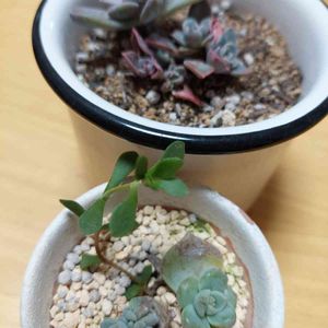 🏷️毎月13日と14日は葉挿しの日に 参加させて下さいね💚💚 うちの現在進行形の葉挿しっ子(手前) と成長した葉挿しっ子(奥) 寒い🥶から家の中でバシャッ🤳