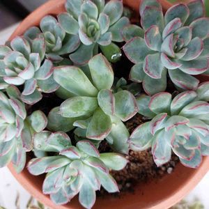 🏷️ド真ん中の日 参加させて下さいね💚 名前落ちしてしまい名前がわからなくなってしまった多肉チャンです🍀💚 真ん中にいる子が親株で周りが子株なんです😁 親株に成長点から花芽が出て😲お顔が整形したみたいに変わってしまいました😅 だから子供達と顔が似ていないの🤣 見えにくいけど周りにまた赤ちゃん👶が出て来てます🎵