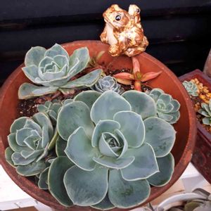🏷️Iloveはちゅ に参加させてくださいね🐸 昨日、夕方にスーパーに言ったら信楽焼の陶芸市を特設会場で開催してました😆 お客さん誰もいなくて💦 ゆっくり見てこの蛙さん親子を買いました🐸🐸 前から写したら子カエルの白いお腹しか見えないので💦横に置いてみました🐸 去年✂️した七福神さんがやっと 大きくなり子どもも出て来ました💚