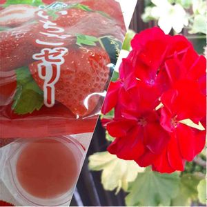 間に合った🎵 🏷️毎月15日はいちごの日に参加 します🍓🍓 ⬅️冷蔵庫に冷やしていたいちごゼリー🍓仕事から帰って来て食べたら美味しかった😋🍓 ➡️ゼラニウムカリオペ葉っぱが黄色くなって来たけど💦お花は元気に咲いてます🌺❤️