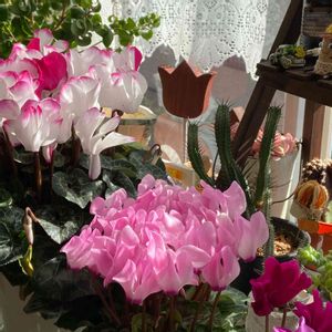 💗シクラメン💗 年末から出窓を華やかにしてくれてます。 置く場所がここしかなくて、だいぶ混み合ってます😆 今、家の電話かかってきて出たら靴の買い取り業者でした🙁 もう家の電話いらんかなぁー🤔