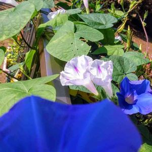 朝は窓から外の朝顔の花🍃を眺めます(´∀`;) 今朝はフェンスの白い朝顔に何年もこぼれ種のブルー💙💎🔷が加わっていました~‼️