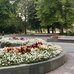 早朝散歩 ベンチの向こうにも カラフルな花と 木の間から ミストの噴水が見えました ニュージーランド南島クライストチャーチ中心部セントラルスクエア