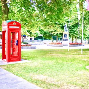 緑の木の下の 赤い電話ボックス ニュージーランド南島クライストチャーチの 早朝散歩の セントラルスクエアの道沿いでみました 市バス 電話ボックス 郵便ポストは 赤が 使われていました