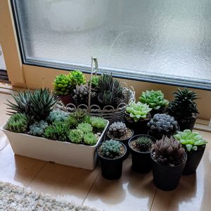 こんばんは🌇 ハオルチア硬葉系の寄せ植えです🤗 以前のハオルチアの寄せ植えの鉢を解体して土を新しくして新入りさんを仲間入りしました🥰 スーパービッグバンド(賑やかなネーミング🎺🎷🎸♫🤗)とコアクタータは夏にお花屋さんで出会って出番をじっと待っていました😊 駅🚉のイベントで150円で偶然見つけてお迎えした子は名無しさん💦だけれどもカラーが可愛いです😊 以前からいた子達は背が伸びて子株が出来ました🤗 ちなみに鉢も重曹で磨きました😂 元気に育ってね🤗💕