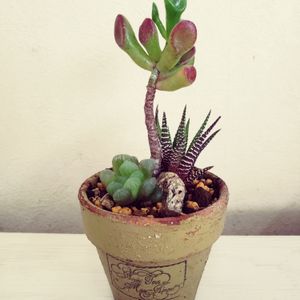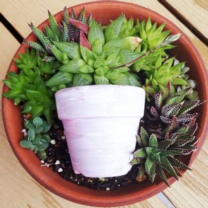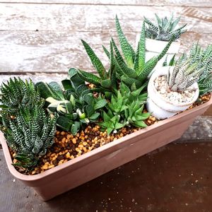 ハオルチア 軟葉系 寄せ植え 先月から更に1ヵ月 京の華錦 全斑の今 右側葉が2枚枯れたけど維持してます。他が成長してるから前回投稿とちがうのがわかるかな🤗