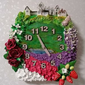 今日も雨ですね~長方形の茶色の木製の時計に粘土で風景をイメージして作ってみました 出来上がりました88888! 電池入れましたらなんとこの電波時計1時間早く設定されてますが 自動なのでその内に正確な時間に表示されるでしよう。