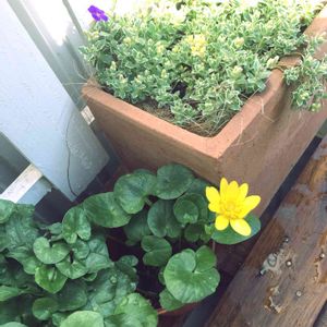 母の庭からきたリュウキンカと 何と!! 夏越ししてくれた紫のお花も開花♡ 期待していなかったのでビックリ‼️ 北側の涼しいところに移動してあげれば 大丈夫でした(=´∀`)人(´∀`=)