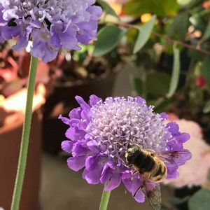 スカビオサ ブルーバルーン。 [鉢=蜂 ∑(゚Д゚)シマッタ] ↓ 早起き蜜鉢さんかな?と思ったら、仕草やフォルムが何か違う。 調べてみたら花アブさんのようです。