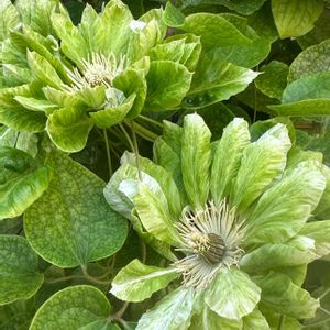 クレマチスグリーンパッションが34個咲きました😊 段々とシベが伸び始め、もう少しすると金色に光ります🤩更に伸びてクルクルになるのが楽しみです💕 ネットから。 形の良い八重咲きで、クレマチスには珍しいグリーンの大輪です。 新旧両枝咲きで、旧枝から咲く春の花は緑色で咲き白く変化し、新枝から咲く夏秋の二番花は白に緑の斑入り花となります。 季節ごとに色の移り変わりが違い、蕾から咲き切るまで異なる表情が楽しめます。 花のつき方:新旧両枝咲き剪定弱剪定 花後の剪定花柄を摘み取る。新梢を2節残してカット。 2月の剪定古枝に花芽を持っているので、枯れた枝を取り除き、芽の先端を剪定する程度。
