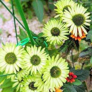 エキナセア グリーンジュエルさん 強風でお辞儀、短く切るのも可哀想で 紐で補強 ランタナさん 次から次へと咲いてくれて優秀な子🩷