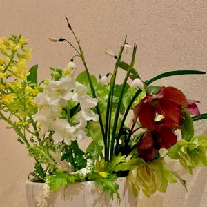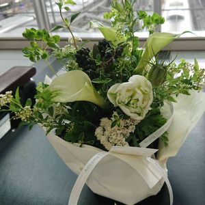 プレゼント用に白とグリーンでアレンジメントを作ってもらいました。かわいい〜🥰 急いでいたのでお花の名前を聞き忘れてしまい大失敗です…