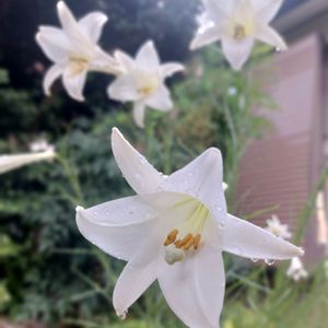 ①庭のユリが咲きました🤍 ②防草シートの隙間か続々と! お盆のお墓参りに供えましょ♪ ③パイナップルリリーが緑になりました💚 ✂カットしてキッチンに飾ったら旦那も息子も『気持ち悪い~😣』って 集合体恐怖症かな?花が緑ってのが馴染めないのかな??