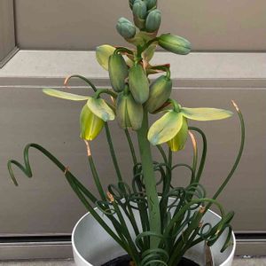 アルブカ(多分、スピラリス フリズルシズル )の花が咲きました。 割と大きなお花なんですけど、いかんせん造りも色も地味なので、私のポンコツアイではうっかり見逃してしまうところでした(f^^)