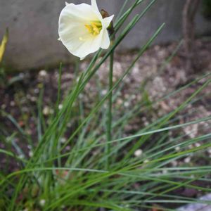 原種スイセン・カンタブリカス。近付くといい香りです。 冬じゅう葉っぱがたくさん茂ったわりに、花は一輪だけ。それも例年よりずっと遅くて、もう今年は咲かないのかと思いました。 ずっと植えっぱなしですが、たまには掘り上げてみようと。