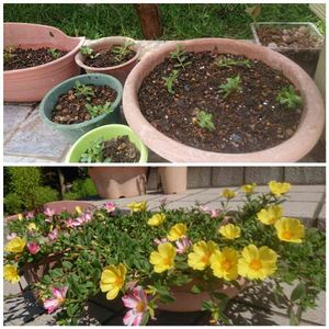 3週間前に挿し芽したポーチュラカを植え替えました。 ピンクと黄色、咲いてほしいなぁ😃