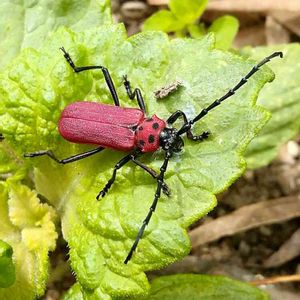 畑に行こうと アジサイ通りを歩いていたら 青じその葉に、 真っ赤な虫さん発見👀💡 ベニカミキリが撮れました🍀