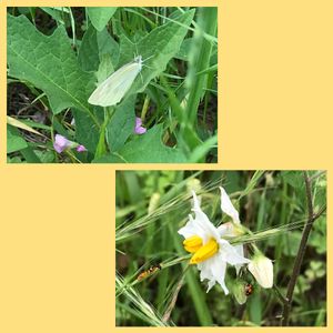 こんばんは ⚠️植物と蝶や虫さんです🙇♀️花粉を運んでくれたり大切なパートナー❤️ポリネーター✨️ ①↖️ワルナスビ🍌の葉で休むモンシロチョウ♡ ↘️ワルナスビの花にハナアブ? ワルナスビの蕾にナミテントウ? ②イタドリにモンシロチョウ♡ ③⬆️エノキの葉にモンシロチョウじゃないなぁ…誰? ⬇️ヒラドツツジに謎の三角形🤔 どなた?中黒朽葉ナカグロクチバ! 5月末のことじゃった