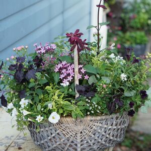 新年初投稿は春色バスケット🪴 バラ咲きプリムラジュリアン プリンアラモードは花びらの赤い縁どりが可愛い♥️ 背の高いローダンセダムと白いミニ薔薇やアリッサム パンジー ビオラはまだモリモリではないけど明るい春色バスケットが出来ました💐✨