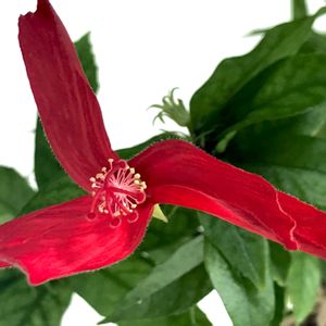 咲くやこの花館 ハイビスカス室 真っ赤です〜がシンプルな花形 「ハイビスカス・クレイ」(原種系) ☞ハワイの絶滅危惧種 カウアイ島に自生するも絶滅が危惧!