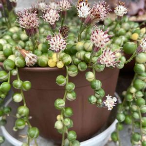 こんにちは(*^^*) 今日は8日、🏷ネックレスの日〜🎵 斑入りグリネさん✨ 今季はお花いっぱい咲いて、まだ咲いています👀💕 でも、一時期よりちょっと弱ってきてる気がするので、植え替えた方が良いのか。。。いや、以前植え替えたら(確かこの時期だった!)梅雨に全滅してしまったので、今は植え替えない方が良いかな?、と🙄 ネックレス系の植え替え(親株)ってそういえば私はほとんどしてないかも💧