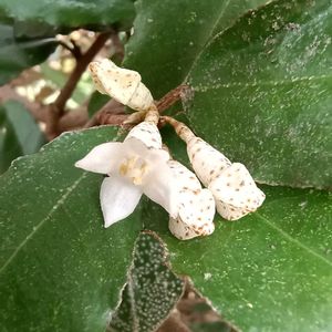 「ヒゴロモコンロンカ」緋衣崑崙花 赤く見える部分は萼 白い小さな花が咲いている ※和名は、赤い萼をもつコンロンカであることから。 咲くやこの花館2025/10/28