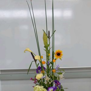 今回は”下からの目線を意識する“というテーマだったので、下から見た時に美しく見えるように考えました。 テッポウユリを下向きに入れ、真ん中に空間をあけてスッキリと見えるようにしました。 オンシジウムとテッポウユリ、とても華やかな作品になりました✨