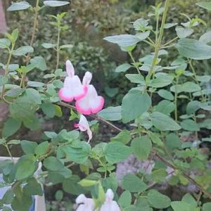 チェリーセージ 今年は2種類咲きました😃🎶 下側の赤白混じりのセージは、友達から枝を頂き、挿し木して初めての花です。 チェリーセージホットリップス〈別名 いちごミルク〉と言うそうです😊 とても可愛い😃🎶