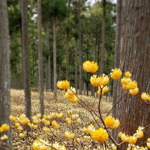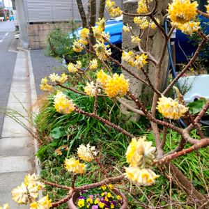 『三椏⚪️🟡ミツマタ』 ジンチョウ科ミツマタ属 こちらのミツマタ 昨年の3月に撮影した物です🤳 名前の由来は 枝が必ず三又に分かれている ということに由来してます。 3本に枝分かれした先に 黄色の花を咲かせます⚪️🟡 小花が寄り添って咲く様子は 薬玉のようです。 和紙などの原料になります‼️