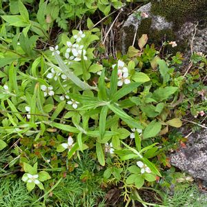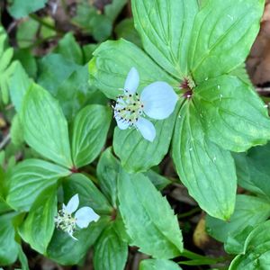 ゴゼンタチバナ (御前橘) ミズキ科・ミズキ属 ゴゼンタチバナ亜属 4枚の花弁に見えるのは総苞片で開花直後は緑色→白色に変わる 緑のままのものをミドリゴゼンタチバナと呼んだりするようです。 花は中央の小さなかたまり。秋には橘の実というよりはサルトリイバラの様な赤い実がなりますが美味しくないとか💦 マイズルソウの近く林中(日陰)に生えてました。