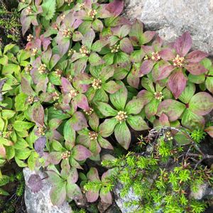 ⬆️ハクサンフウロ(白山風露) *フウロソウ科フウロソウ属 花期は7〜8月 東北地方〜中部地方(伊吹山まで)の高山の雪渓周辺の草地に生える! 5花弁の花色は濃淡を差があり 上向きに咲かせる! 葉は掌状に5〜7深裂し粗毛あある! ⬇️ゴゼンタチバナ(御前橘) *ミズキ科ミズキ属 花期は6〜8月 北海道〜四国の亜高山帯や高山帯の針葉樹林内で見られる! 葉は 花の付くものは6枚が輪生 花の無い葉は4枚! 花は 4枚の花びらに見えるのは苞で中央 に十数個集まっているのが花のようです♪ 7月25日撮影 岩手県 八幡平
