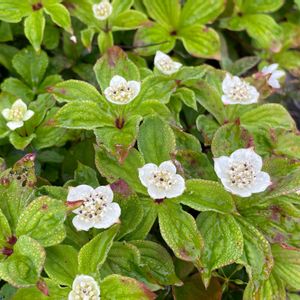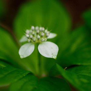 〜 ゴゼンタチバナ 〜 ( 御前橘 ) 花のように見える白い部分は装飾花で、花は真ん中の小さな集まりになる。 雨に濡れて少し青みがかって♬ ミズキ科ゴゼンタチバナ属