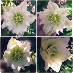 家の名無しちゃん🌸(鉢植え) 昨年の猛暑にやられたのか日陰退避鉢も半数は減少😭 左下は小さめ白ピコダブル ずいぶん前に京○バラ園クリスマスローズフェアでブルーぽい写真のダブル苗を高価で購入💧 種はできない 右上はブラックダブルの子供で初開花😳💕 左上はイエローダブル(クリーム色) スポット入りは無いのと家のイエローピコダブル(本○交配)は高価なせいか数年に1つくらいしか咲かないし種は出来ないしで、悩んだけど今年購入😆 右下はこぼれ種 家には無い小型花で雄蕊雌蕊が退化 たくさん咲いてカワイイ❤ ※ビンボーなので、高価=3000円以上