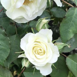 白い花たち アイスバーグ(右 中)が今年は元気です 咲き始めの淡〜いピンクが可愛らしい❣️ ガーベラ(左 上)もいっぱい蕾が覗いてます。 師匠⁉️特製の肥料が効いたのかなぁ〜😃