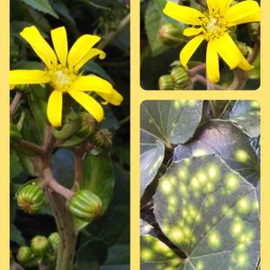 🌸ツワブキの花🌸 (石蕗) 待ってました! 咲き始めました! 我が庭の秋のチャンピオンです。(勝手にそう思ってる) 🌸沢山固まって咲くととても綺麗です🤩 こぼれ種で庭木の裾に 沢山増えて困るくらいです。 常緑多年草。日陰OK! 葉だけの時は艶のあるフキの様に見えますよ。(艶のあるフキということでツワブキとなった説あり) 葉は食べられます。 キャラブキはこの葉で作られるそうです。 斑入りの葉もあるので 載せてみました😀 また、沢山咲いたら見てくださいね💖