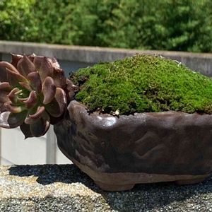 鉢も相まって放置多肉棚でも特に盆栽っぽく仕上がっていた古紫(多分)。 苔がきれいに生えてるので手をつけがたい感じです。