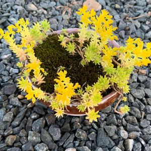 開花中のセダムとコケの鉢。