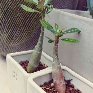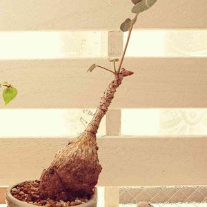種から育てている実生アデニウム(オベスム)2年目。50コくらい撒いた中の優良個体で盆栽風に仕立てる予定で育ててる。根芸が凄いことになるし花も綺麗なんだよねアデニウム盆栽。今年も元気に育つんだぞ〜〜。