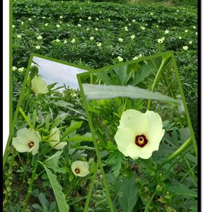 🍀🍀オクラ🍀🍀 ❋❋シリーズ2❋❋ 田んぼ一面オクラ上~ 観てるから~お花が、 小さく見えるが、端に 行くとお花は、大きいです🌿🌿